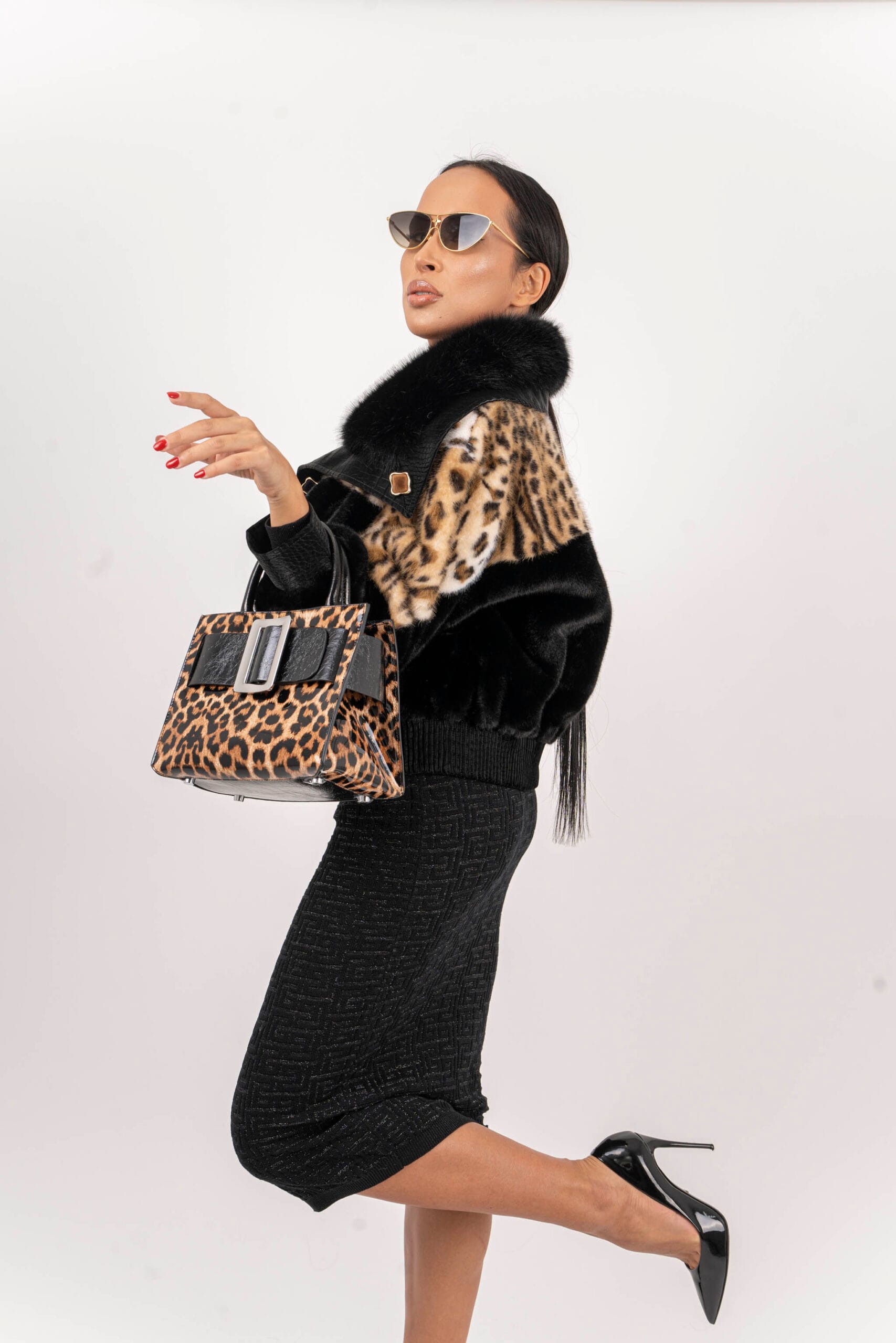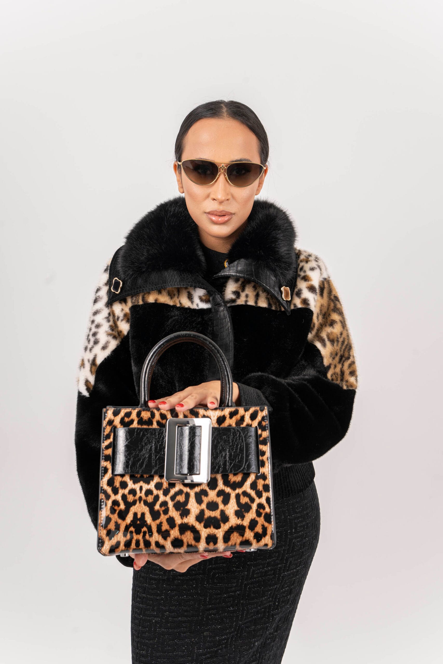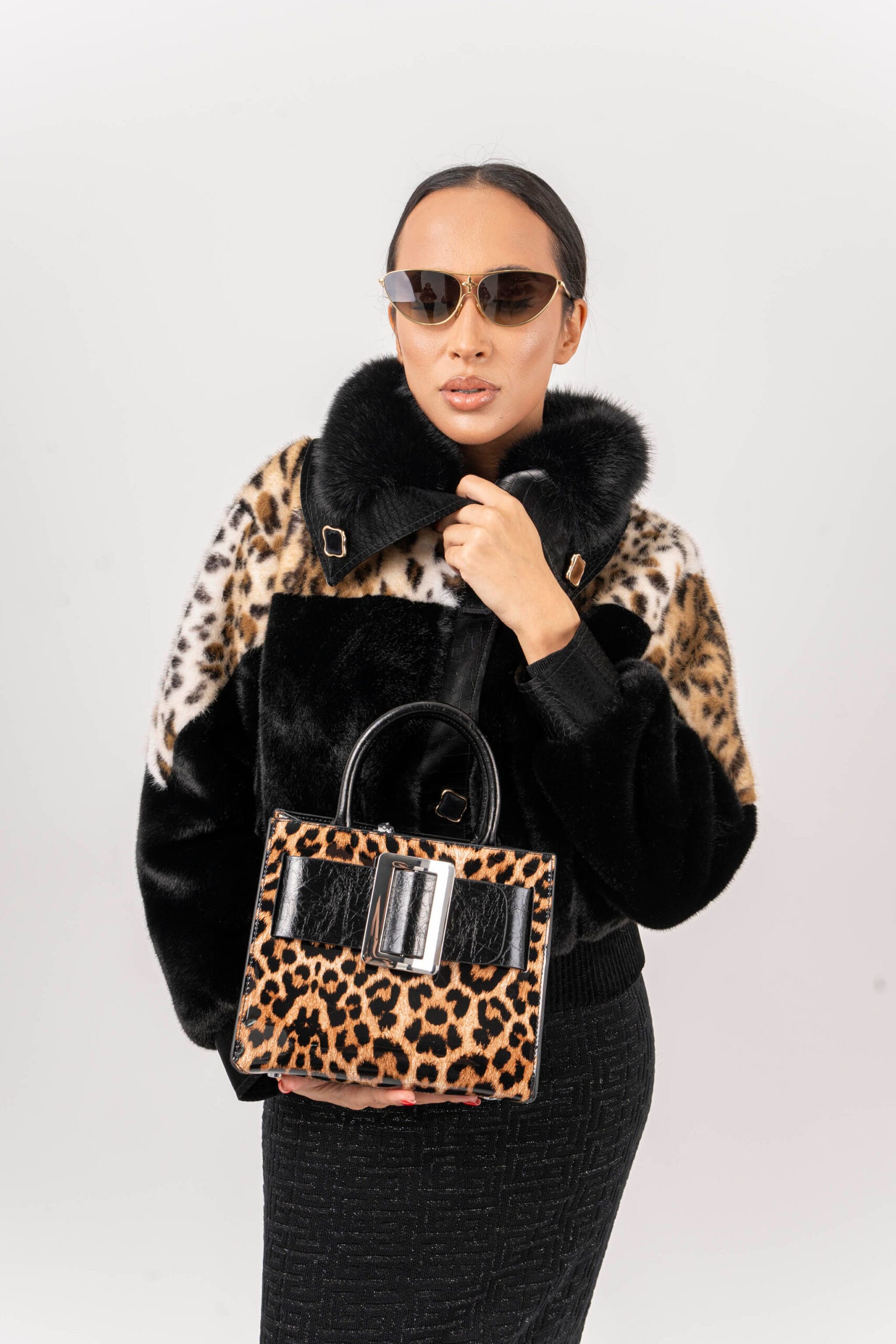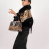 Чанта от изцяло ествена кожа с лак в тигров принт с тока . Чантата има дълга и къса дръжка .