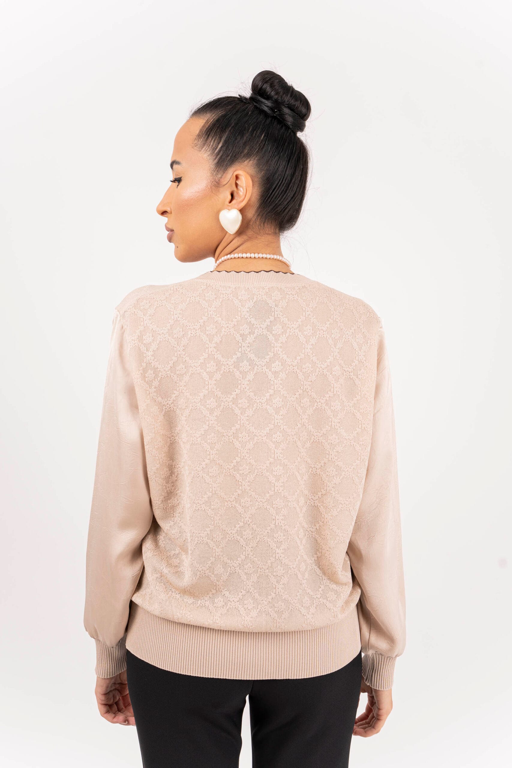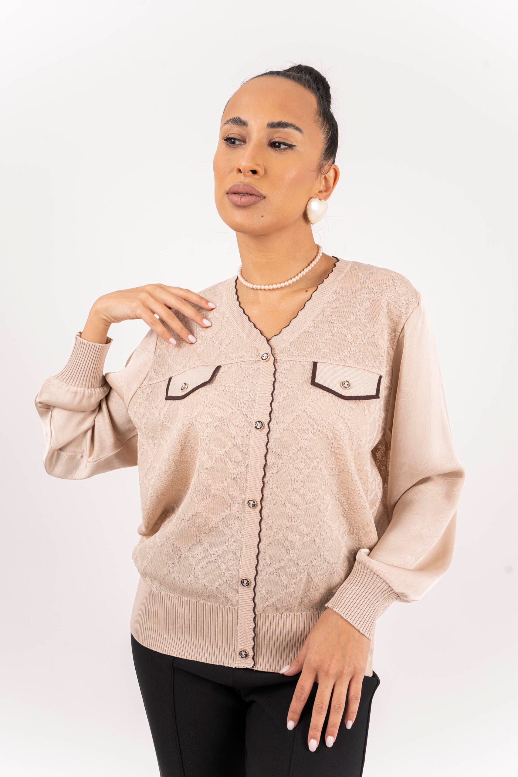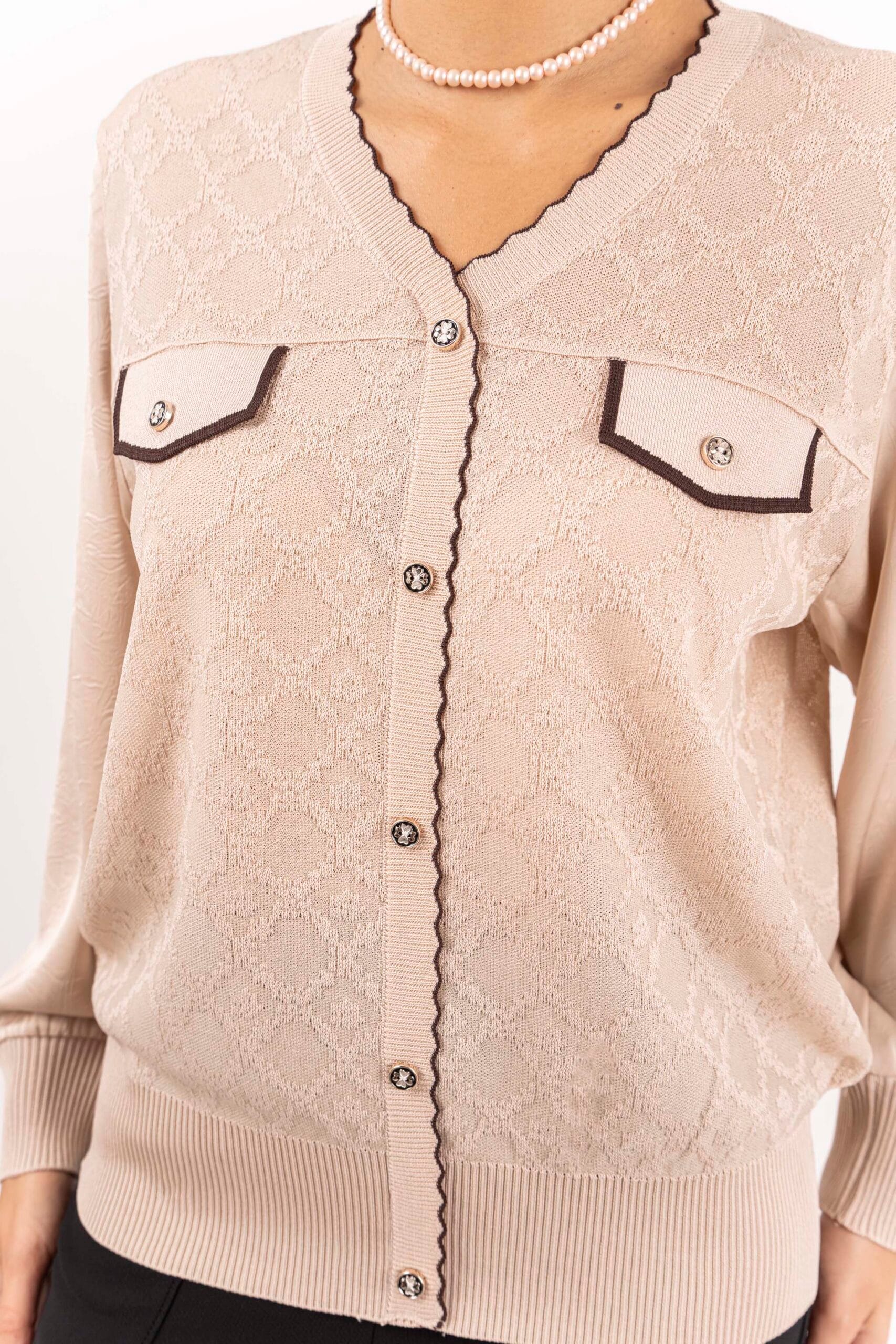 Елегантна бежова блуза тип жилетка с ефектни копчета със златист ефект.