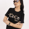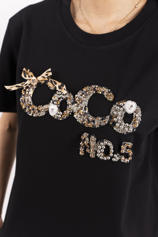 Тениска с уникален акцент тип надпис COCO N0.5 с панделка съчетаващи бляъсък и стил .