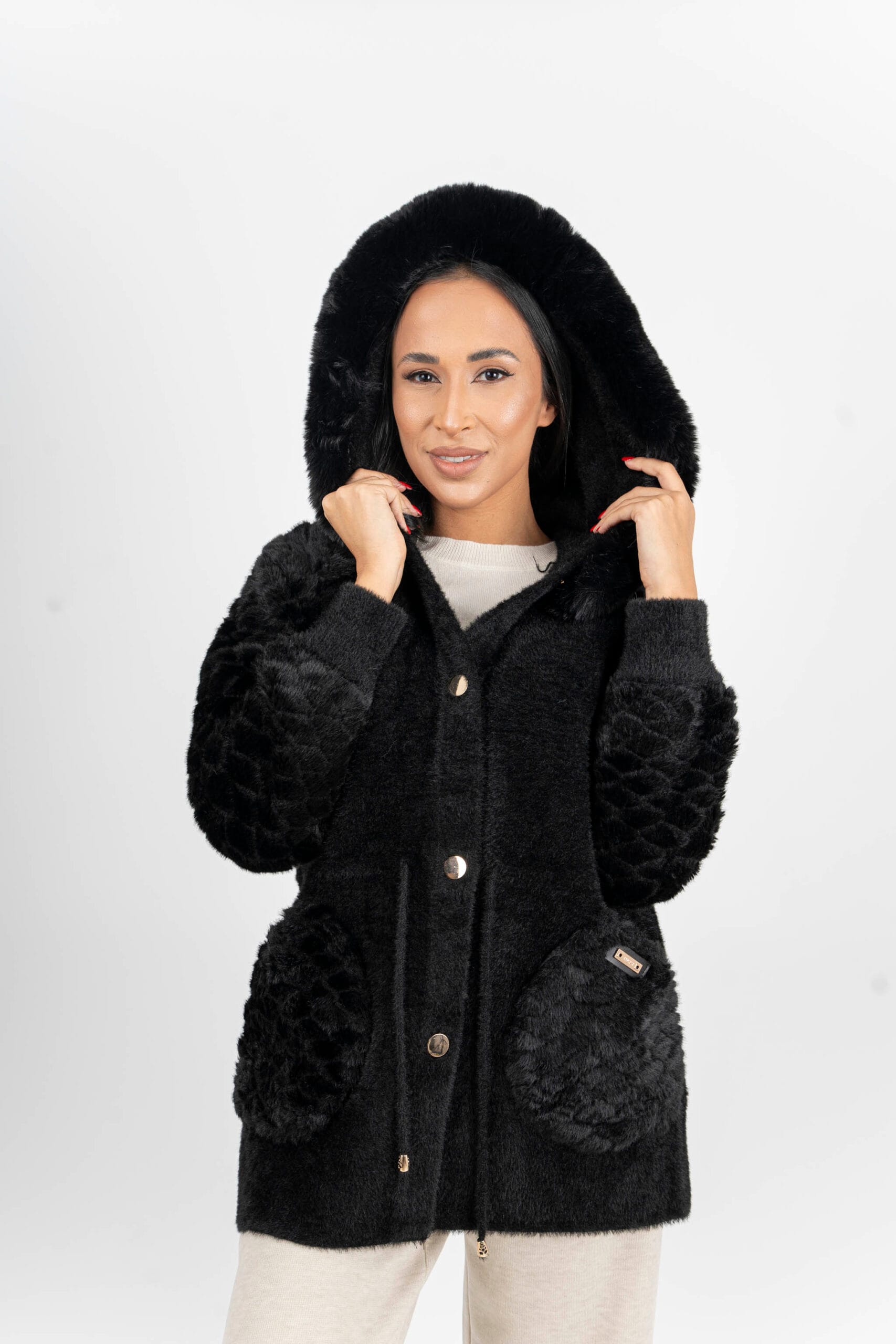 Eko жилетка с пухена шапка и дълбоки джобове и златисти копчета.