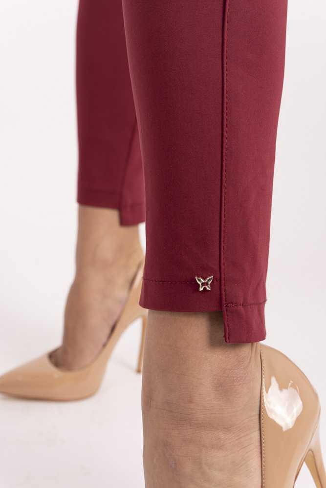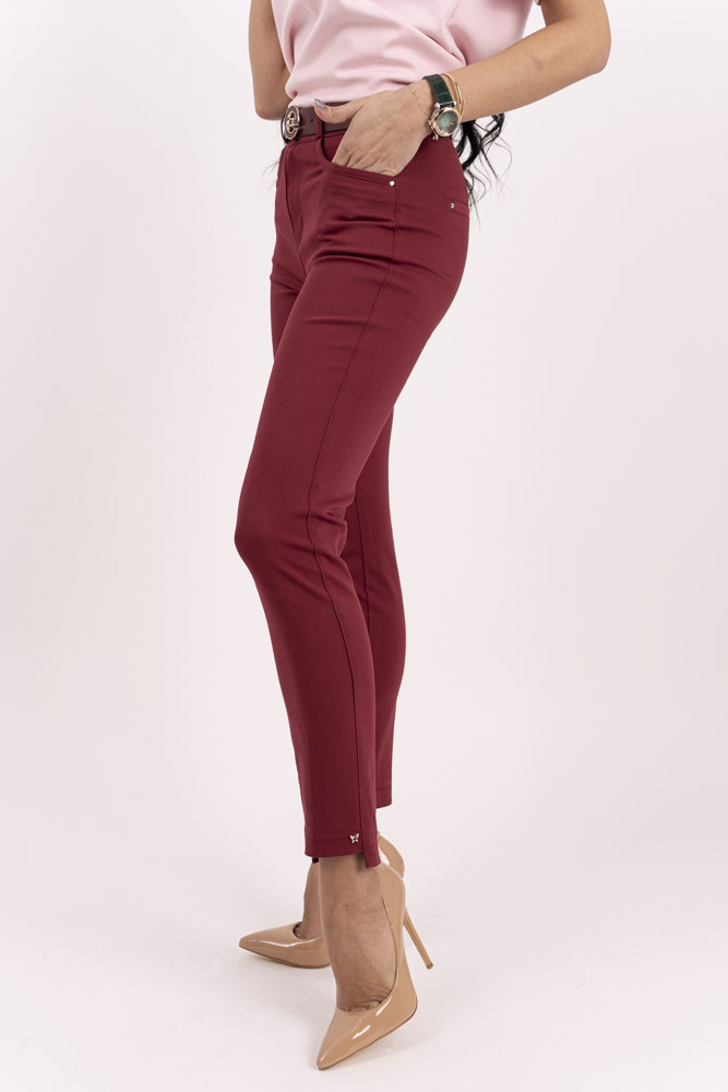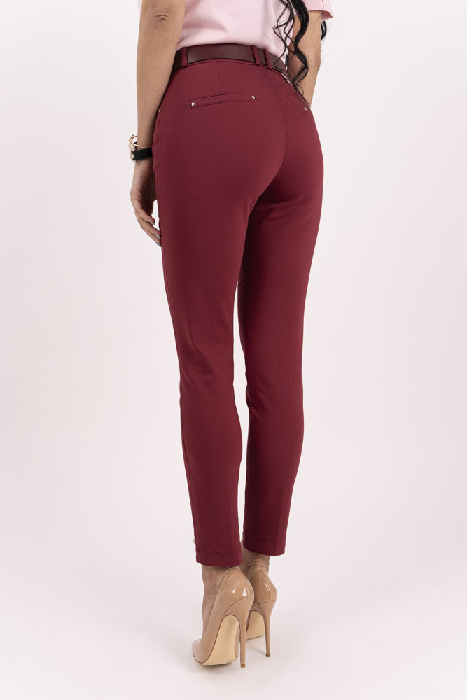 Спортно-елегантен панталон със стеснен крачол , колан на кръста и джобове .