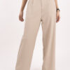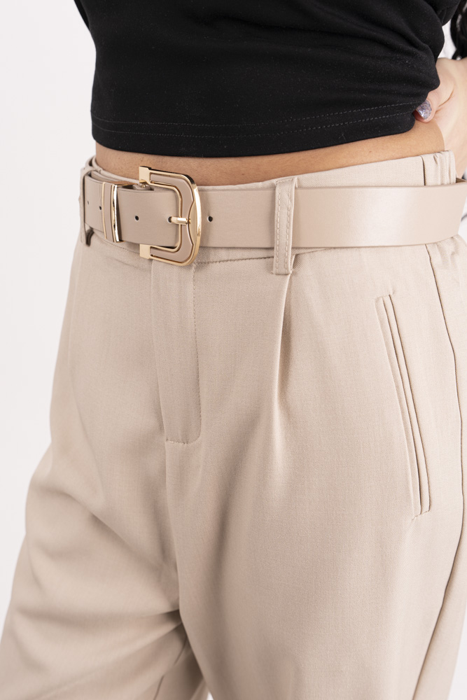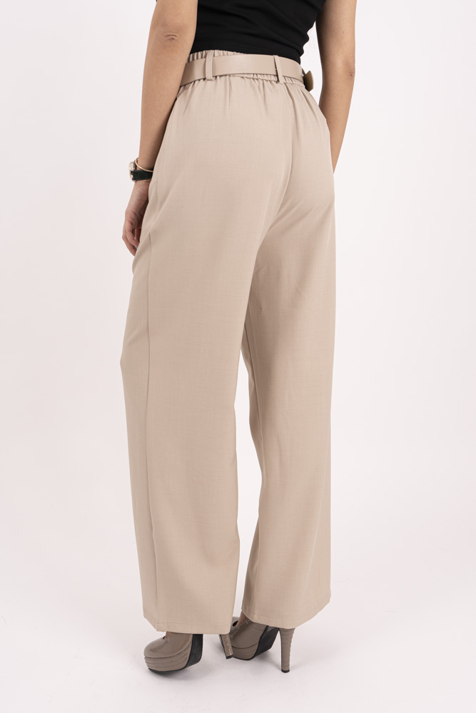 Елегантен панталон с широк крачол , ластик на задната част на кръста и колан .