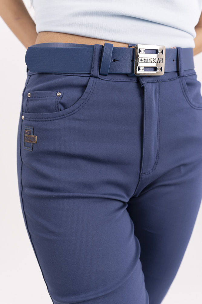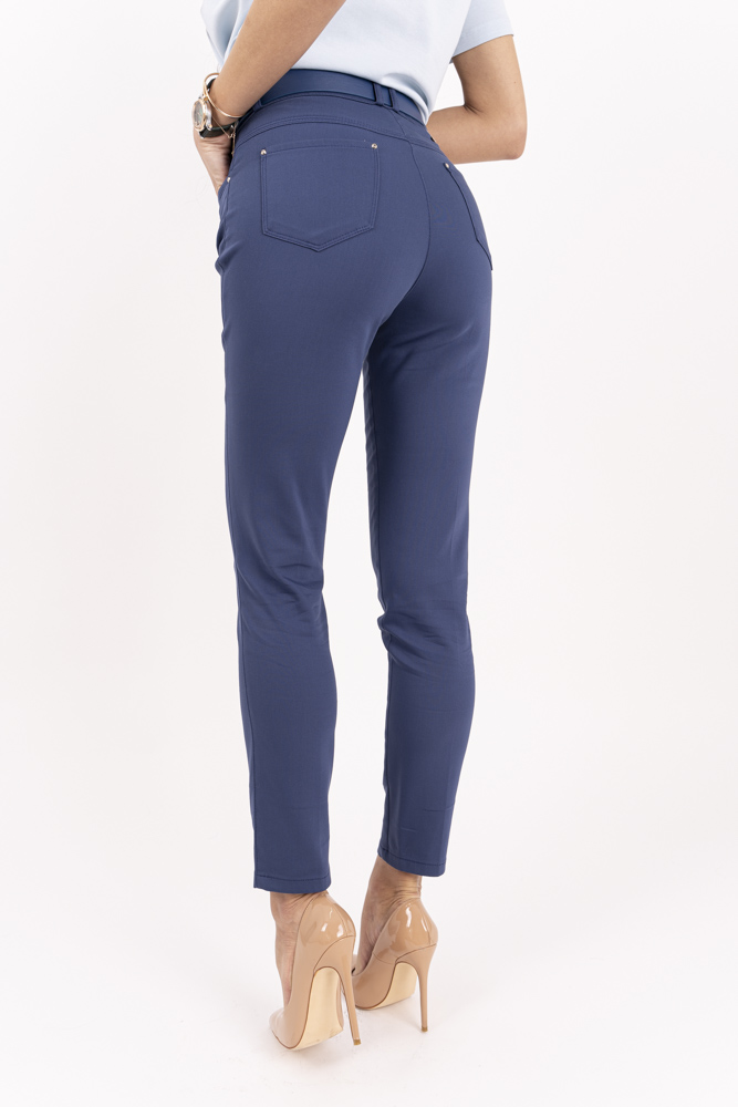 Спортно-елегантен панталон със стеснен крачол , колан на кръста и джобове .