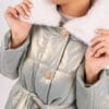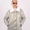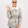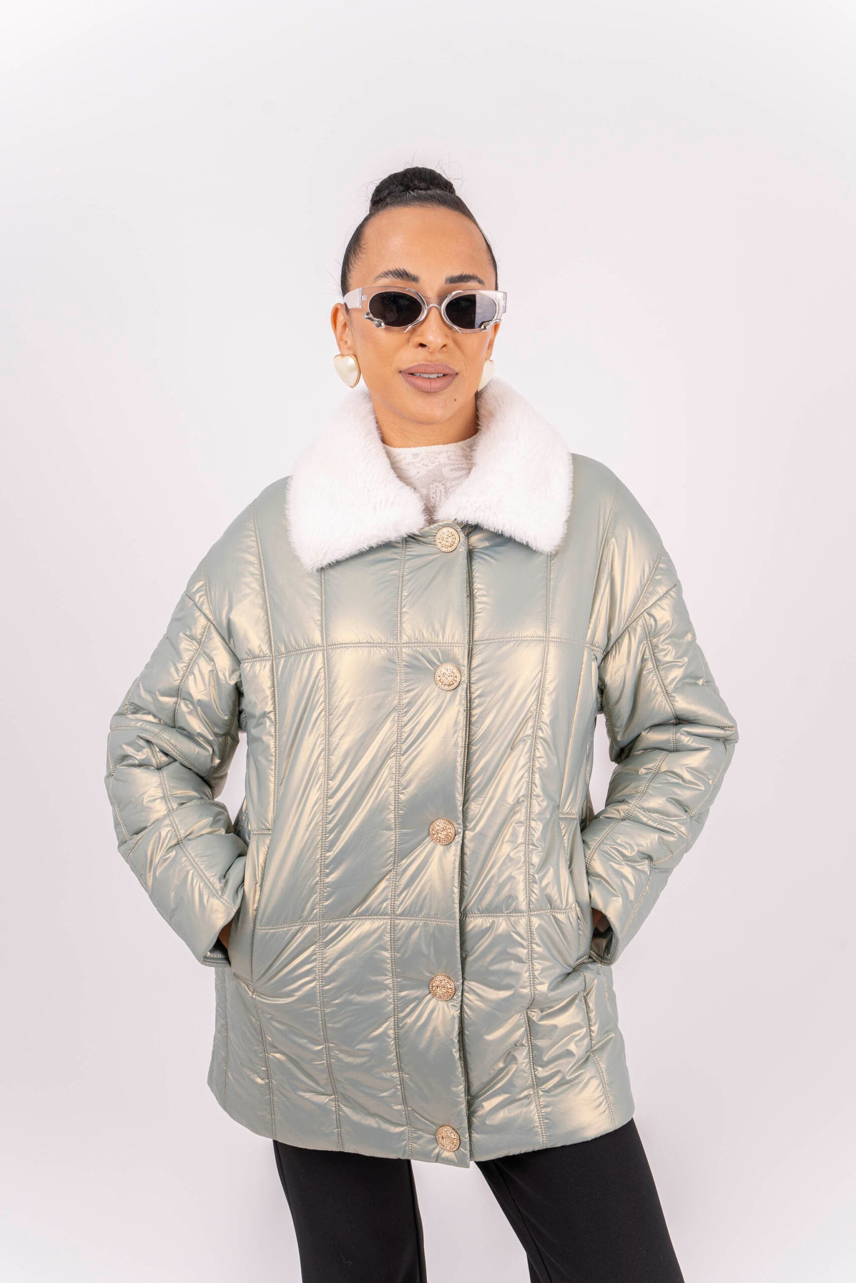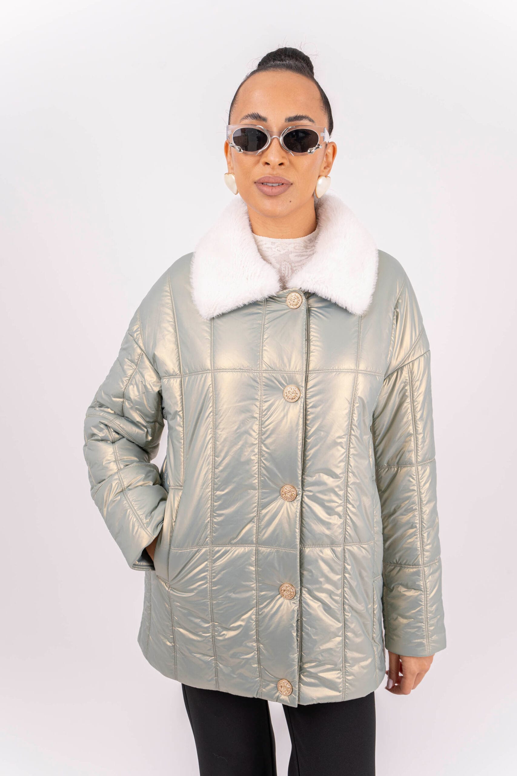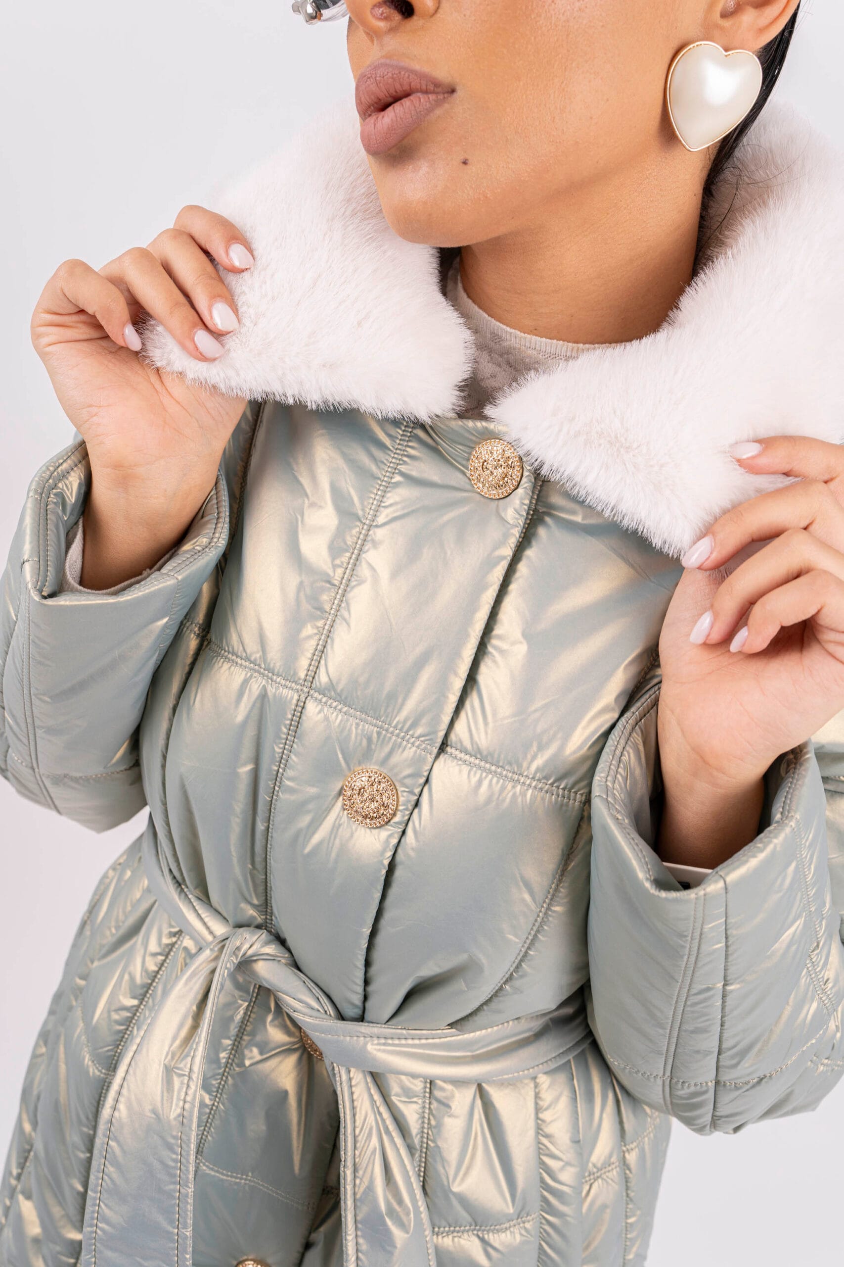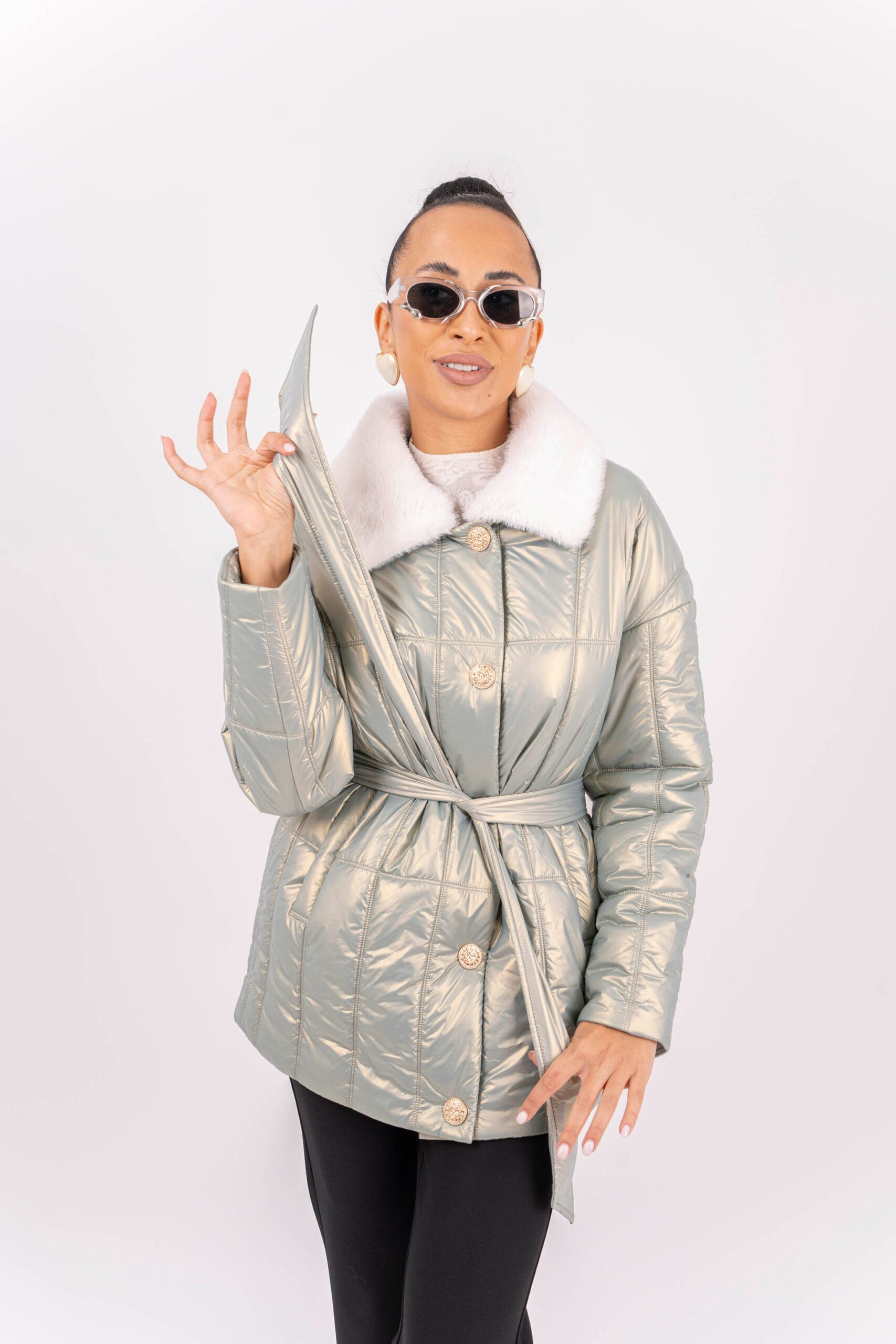 Изключително стилно дамско яке с яка от естествен косъм .много красие зеленикъв цвят с златен отенък.