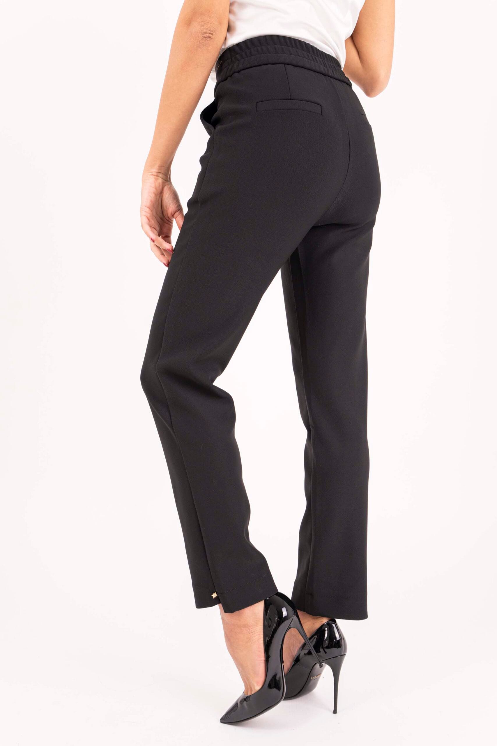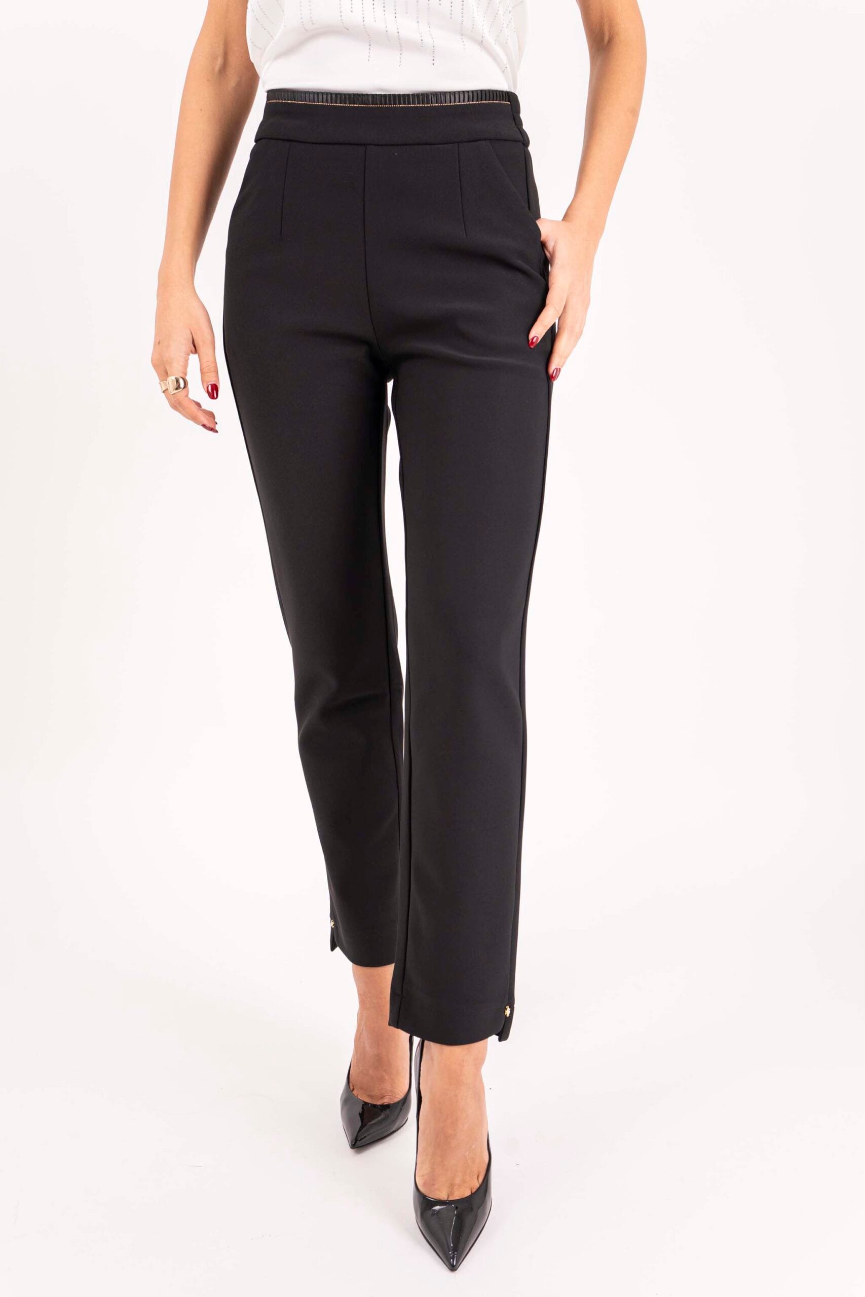 Елегантен черен панталон украсен с фин златен кант отпред и ластик отзад на кръста.