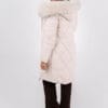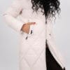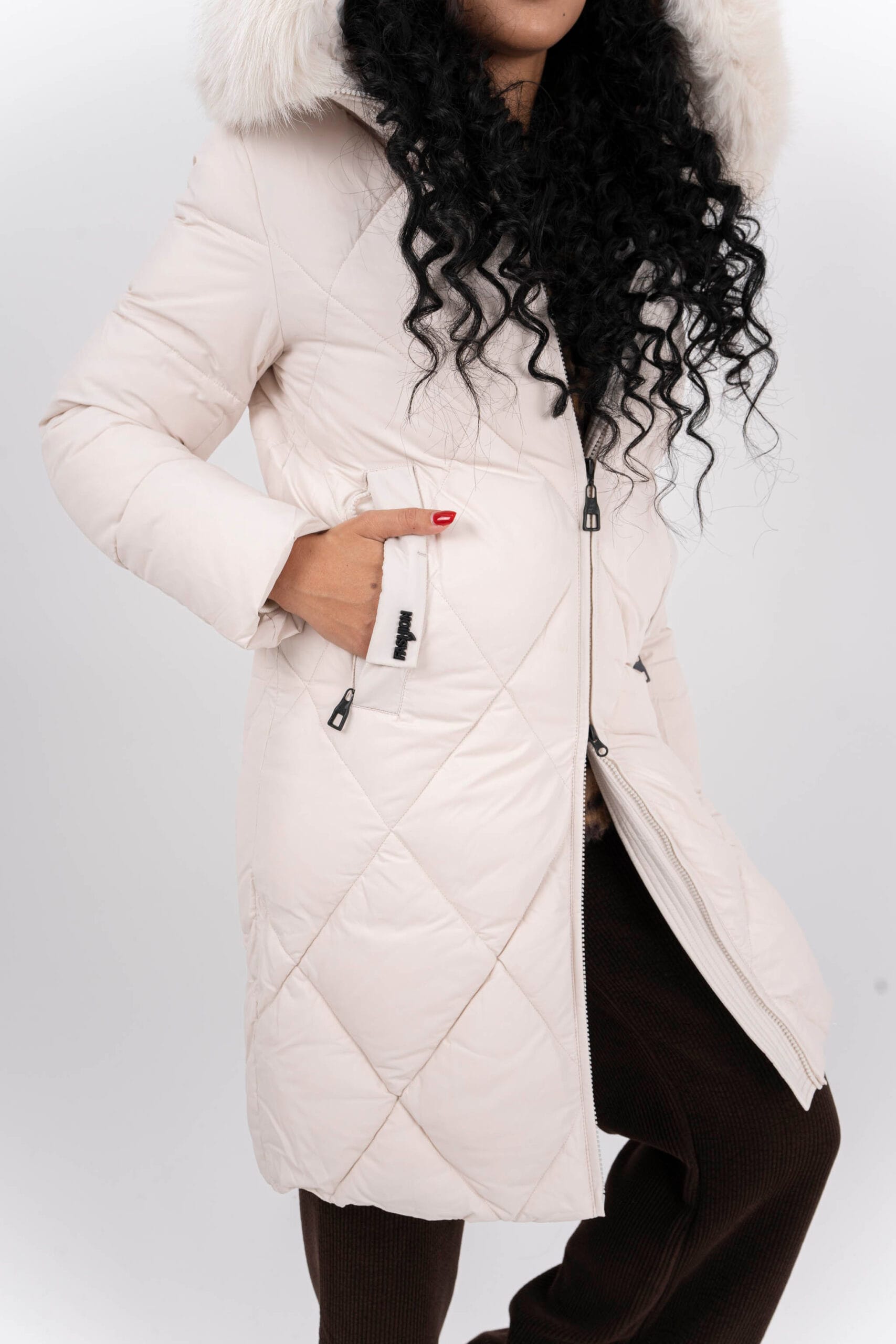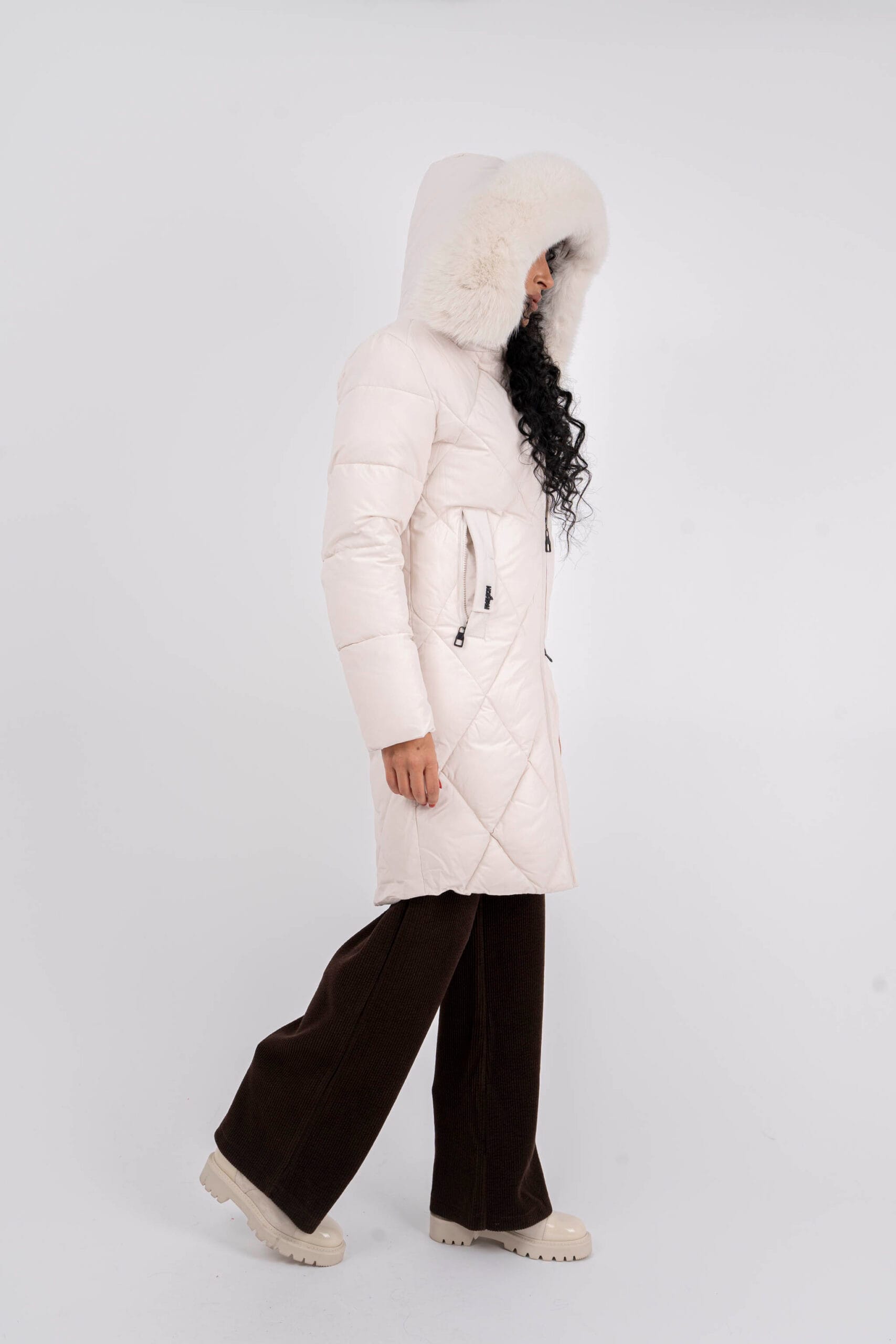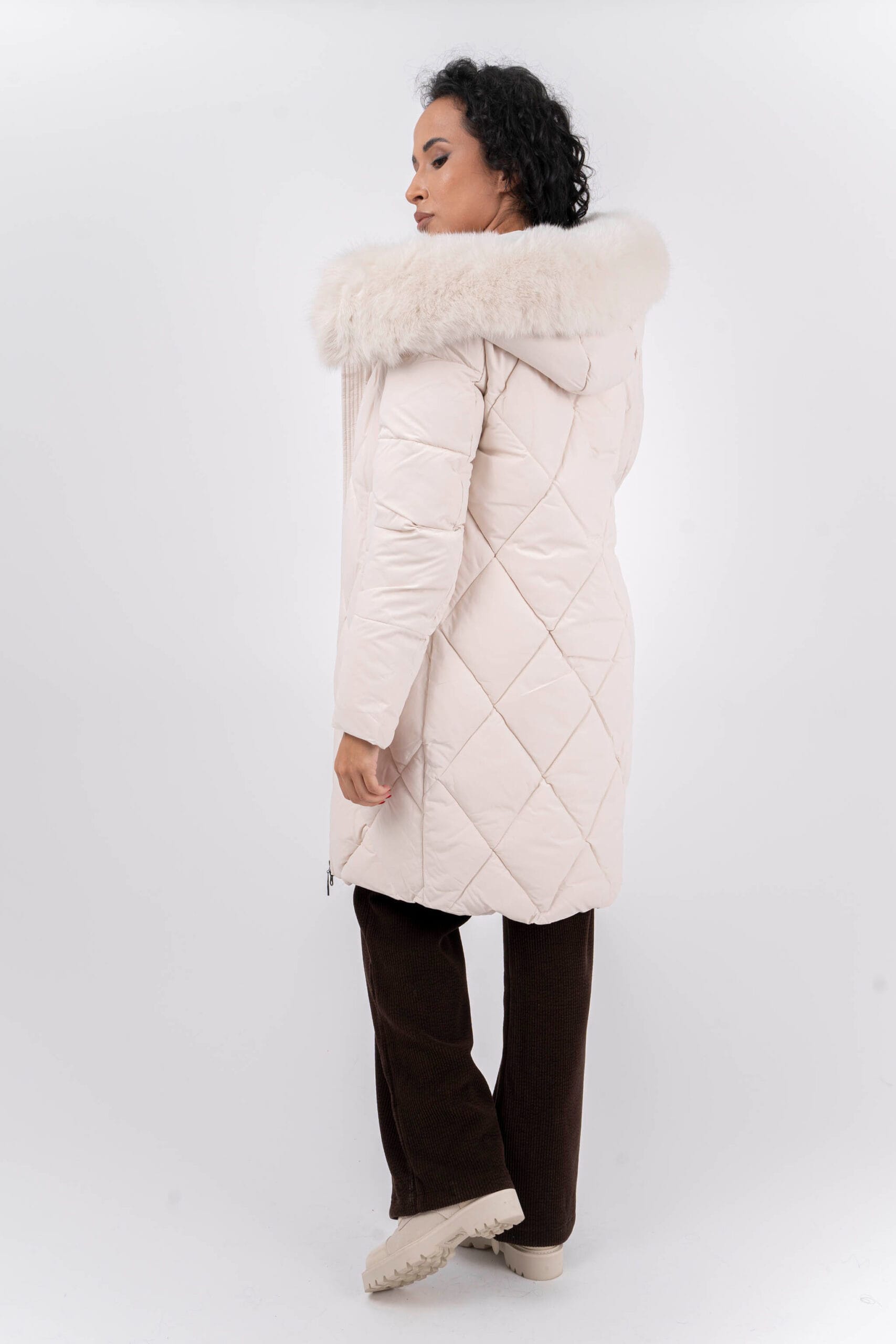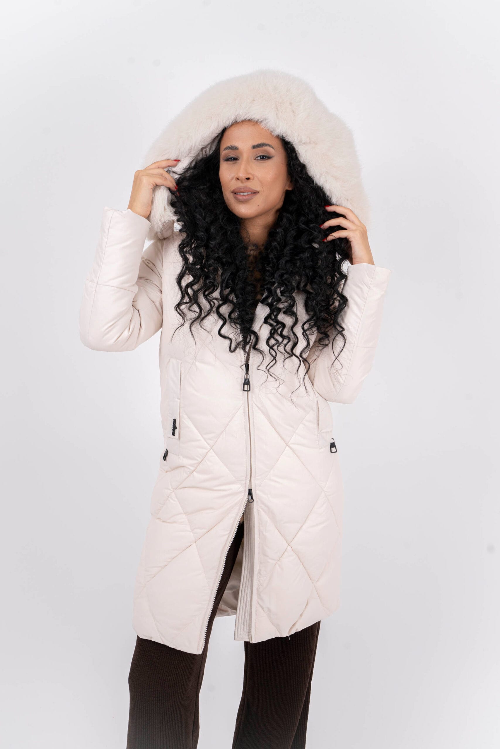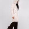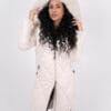 Дълго яке в екрю цвят с дълбоки джобове и голяма качулка. Голяма яка от естествен косъм.