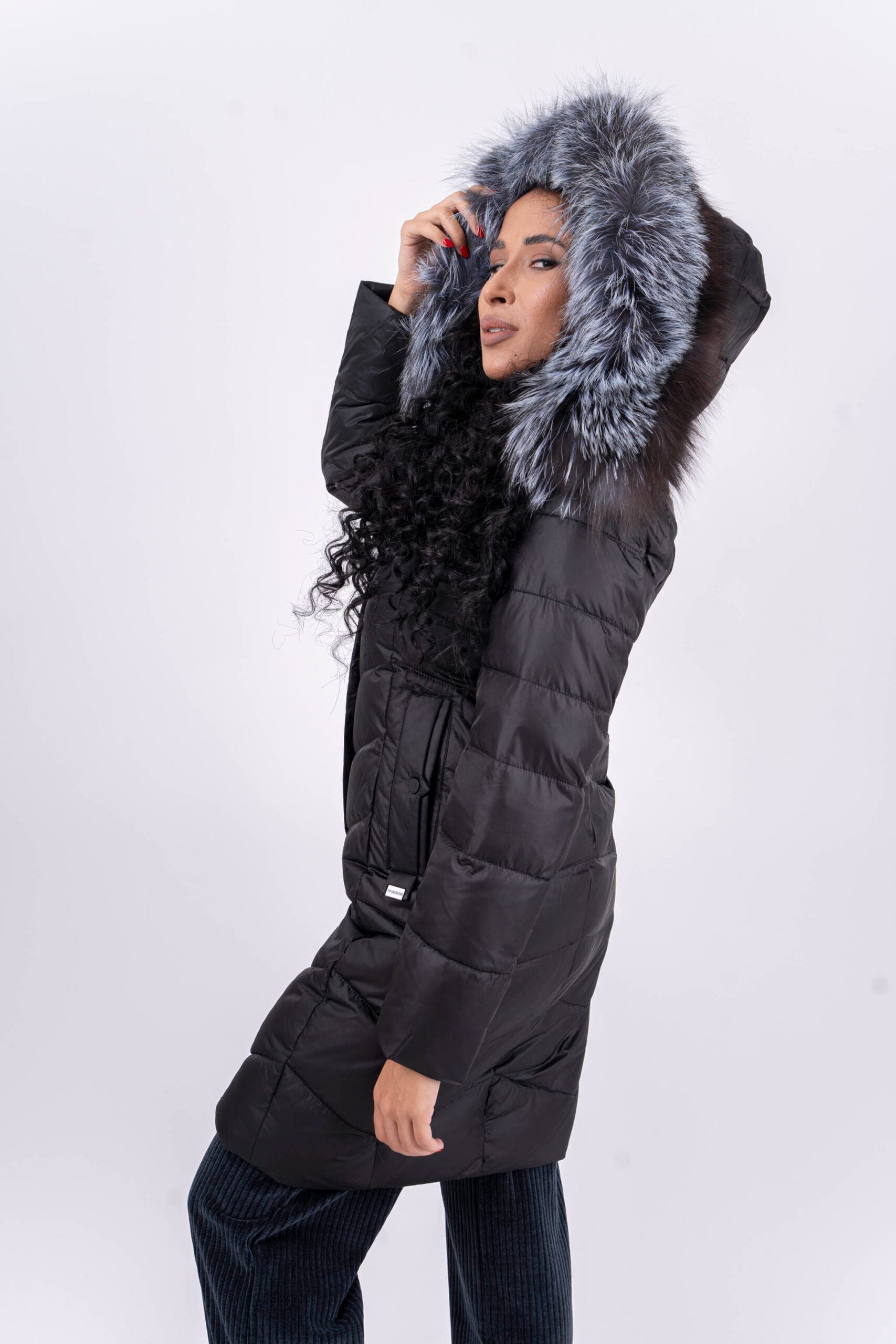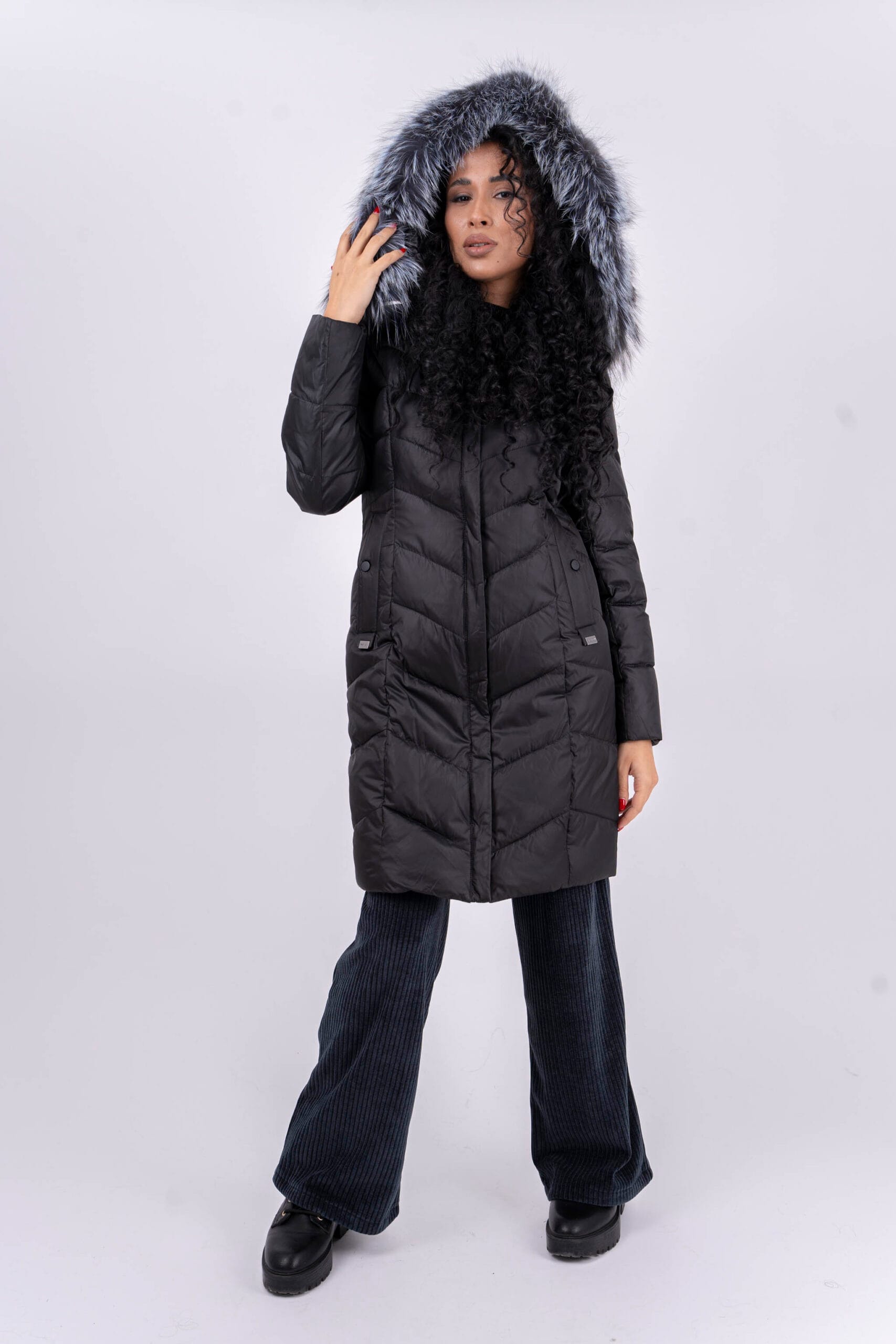 Уникално зимно яке с дължина до колената и естествен косъм яка. Якето е с голяма качулка и дълбоки джобове.