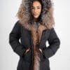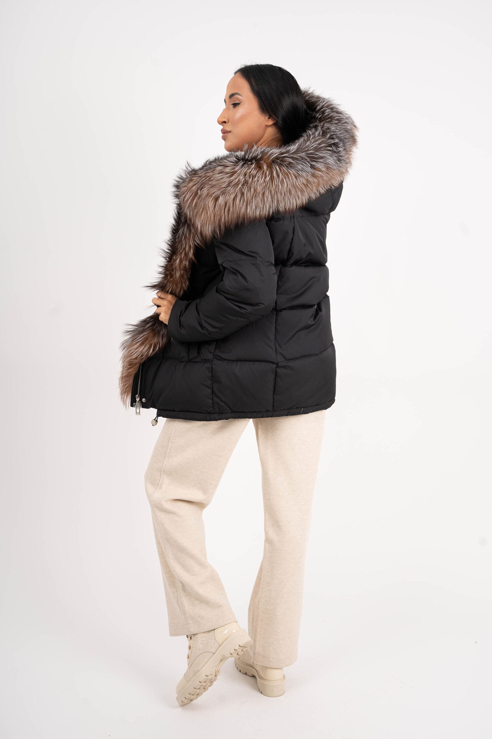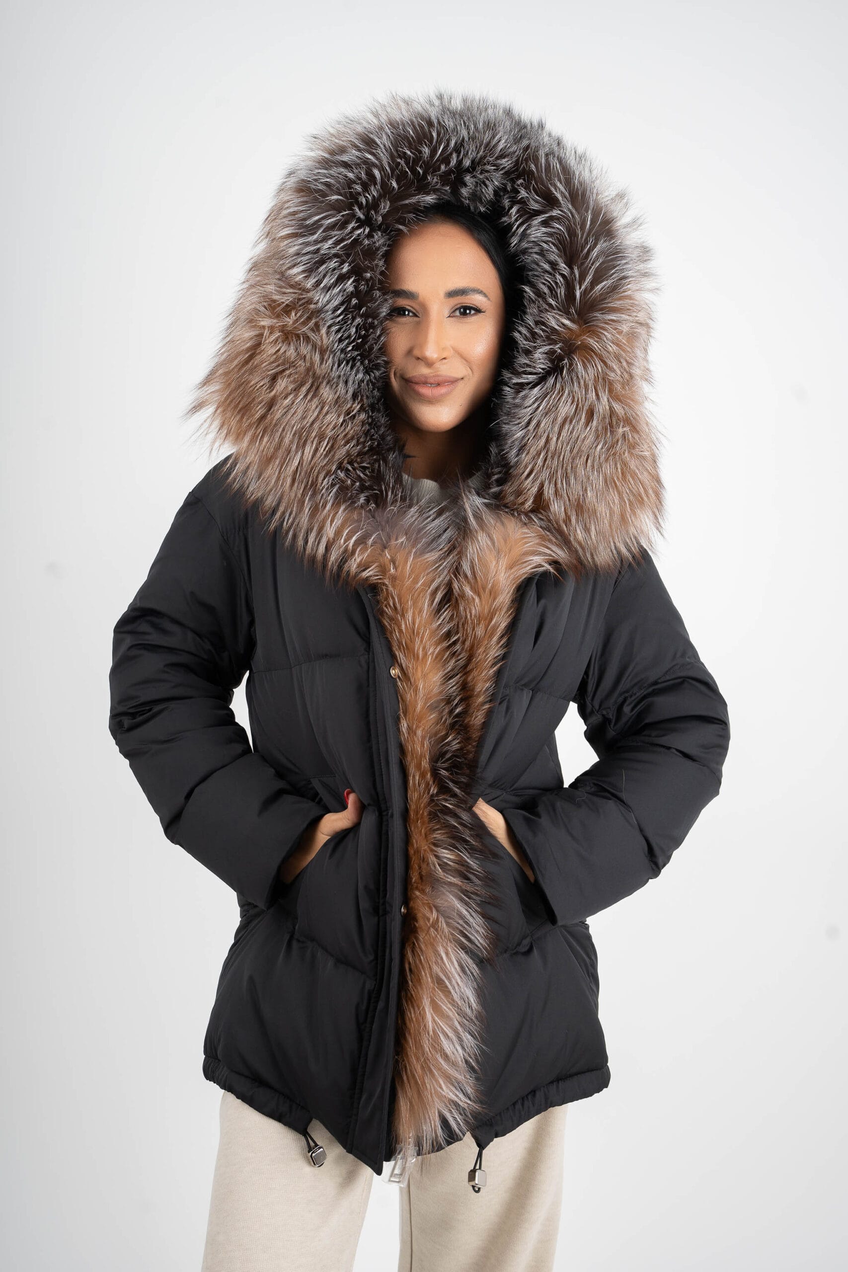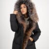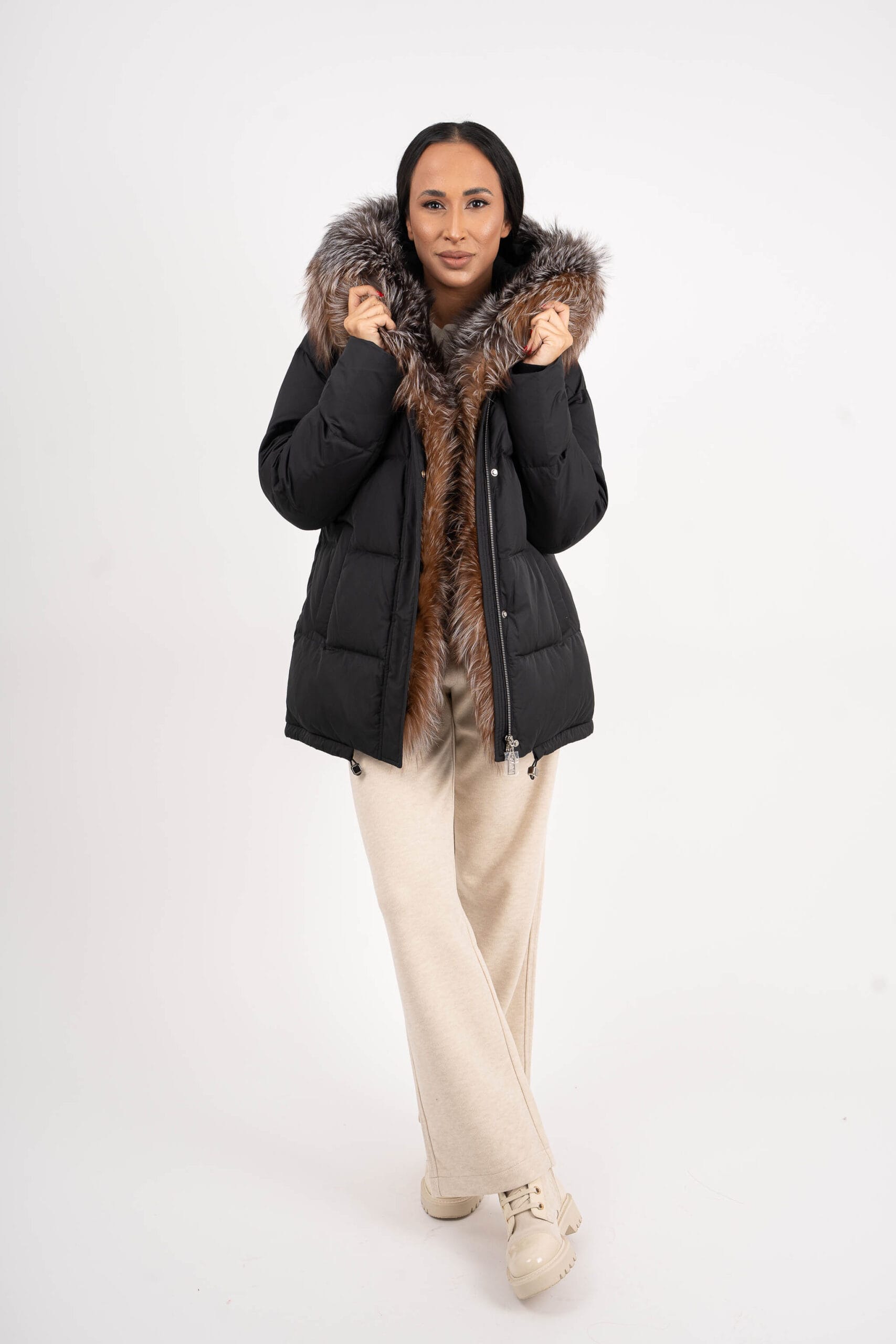 Уникално яке, най-висок клас качество с естествен косъм. Яка от лисица с опция за сваляне. Пълнеж от био пух. Якето има джобове, двоен цип и може да се пристяга в кръста.