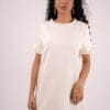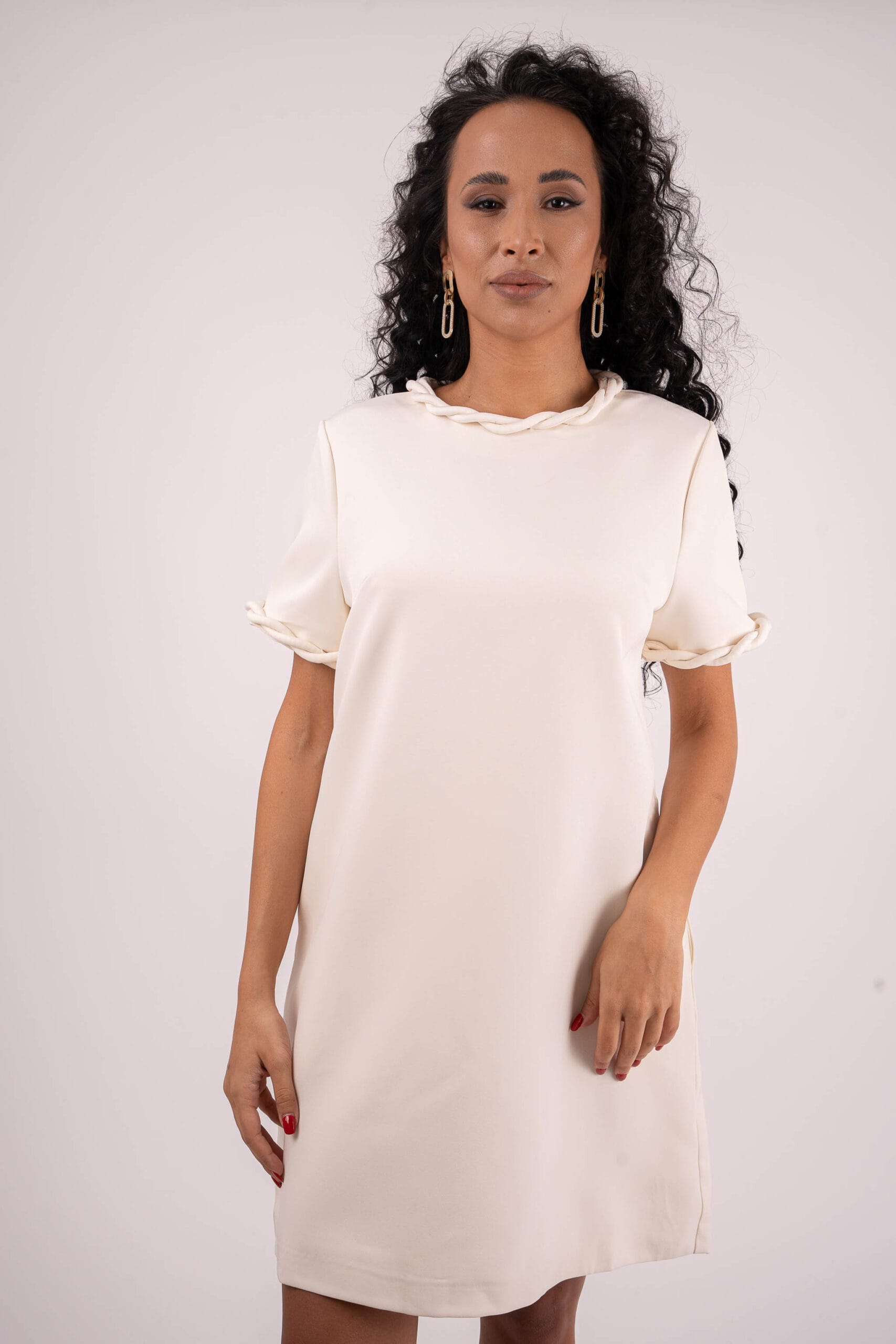 Рокля с плетка на врата и на ръкавите в два цвята .