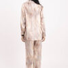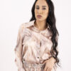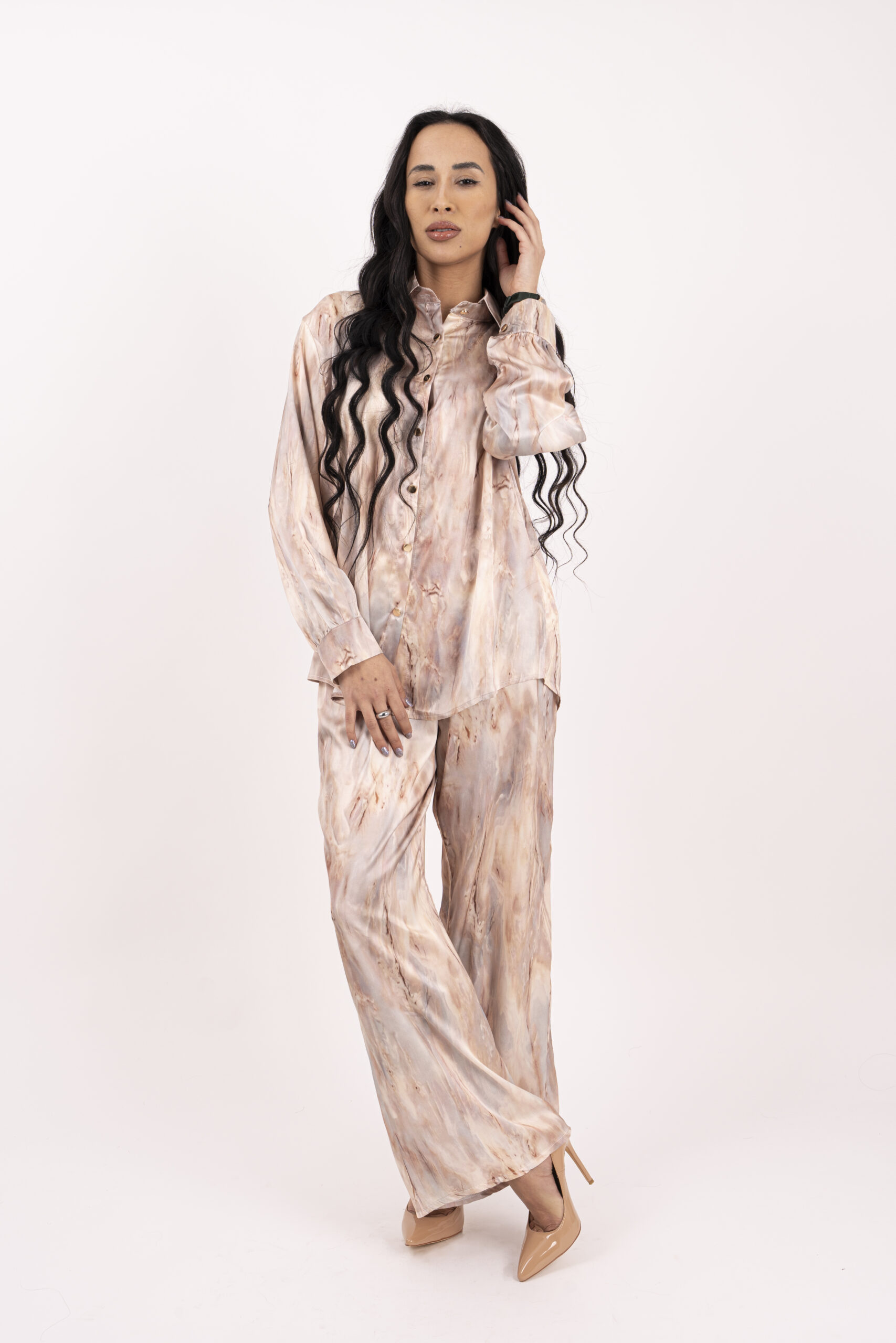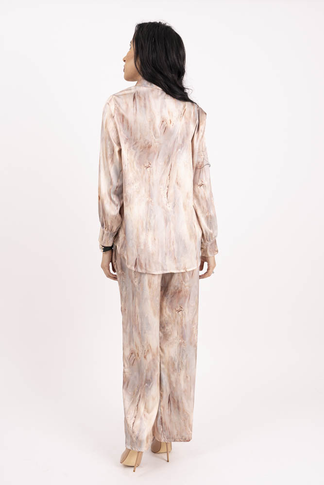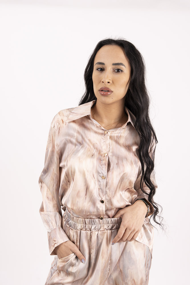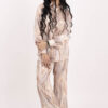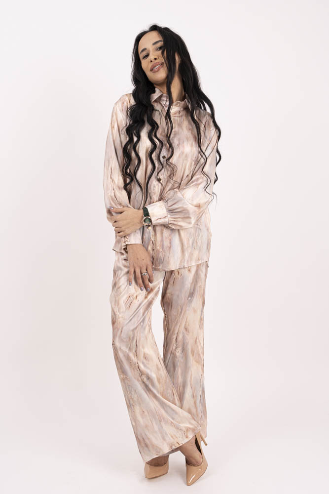 Изключително красив и комфортен комплект от сатен , състоящ се от горнище пристягаща връзка и панталон тип солей с ластик.